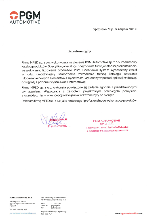 PGM Automotive Sp. z o.o. to konsorcjum firm zorientowanych na eksport produktów, pochodzących od renomowanych polskich producentów samochodów. Ich współpraca opiera się na synergiach produktowych, umożliwiając im odzyskanie odległych i trudnych rynków – ze specjalnością Afryki i Bliskiego Wschodu. Produkty marki „PGM Automotive” zostały opracowane zgodnie z najwyższymi standardami europejskimi, zgodnie z międzynarodowymi standardami IAFT 16949 oraz ISO9001.