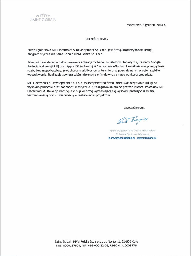 Otrzymaliśmy referencje do aplikacji mobilnej na telefony i tablety z systemem Google Android (wersja 2.3 i wyższa) oraz Apple iOS (wersja 6.1 i wyższa) o nazwie eNorton. Umożliwia przeglądanie szerokiej gamy produktów Norton w terenie oraz zapewnia szybką i łatwą w użyciu funkcję wyszukiwania. Wdrożenie obejmuje również informację o firmie oraz mapę punktów sprzedaży.